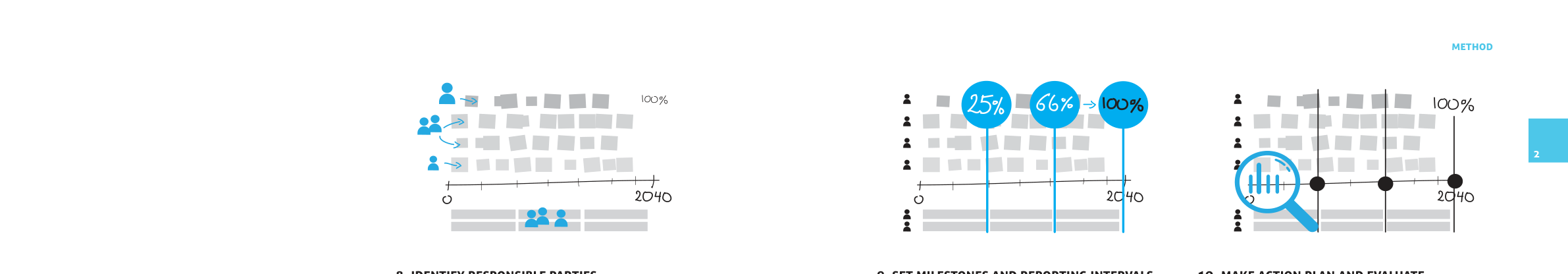 With responsibilities and governance in place, determine how often the project evaluates progress and commits to milestones. For roadmaps spanning decades (city transitions, national strategies), set milestones that hook into existing management cycles: fiscal years, annual management meetings, political cycles.
