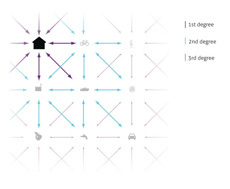 Beyond familiar spatial components, SiD maps the flow of resources, movement of people, value relationships, and ecosystems in geographic space. A Life Cycle Assessment (LCA) typically ignores spatial relationships; SiD challenges you to include them. The impact of exhaust particulates differs enormously between rural areas and dense cities - context changes the score.