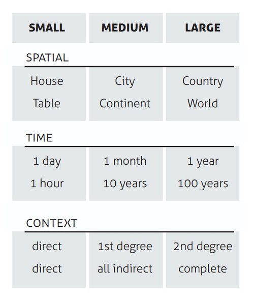 Scales in context measure relationship depth. For a multinational: first level is the company itself, second includes primary suppliers and customers, third encompasses everyone affected. The Global Reporting Initiative uses the same tiering (Tier 1/2/3). Complexity grows exponentially at each step.