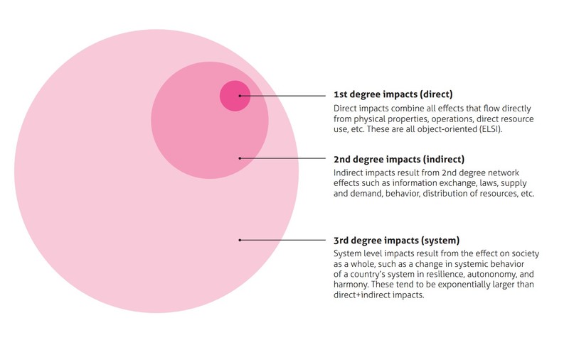 1st level - Direct Impacts: Directly and materially linked to an action. Measurable in kWh, temperature, GDP. Easy to quantify but limited in capturing systemic influence.